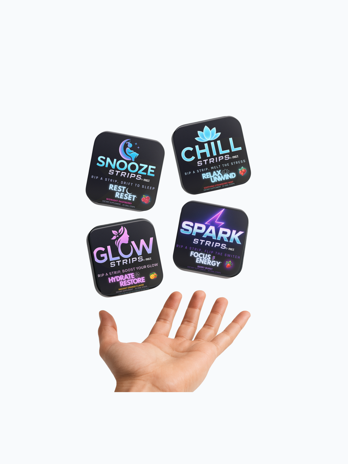 Each Melt Strip™ targets a core pillar: Energy & Focus, Deep Rest, Stress Relief, and Skin Wellness, all working together as a clean, efficient daily protocol for total mind-body performance.