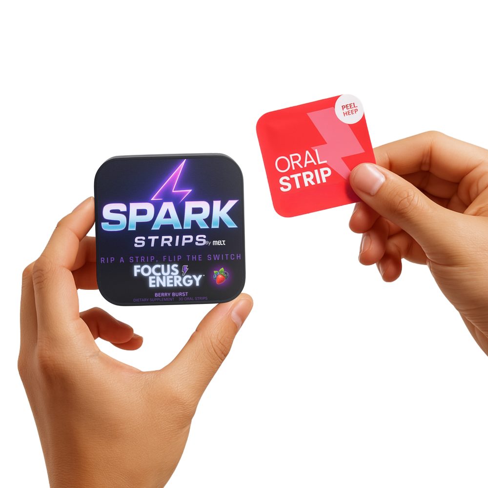 Spark Strips™ deliver a precise blend of Caffeine, L-Theanine, B-Vitamins, in a 30-second melt-in-your-mouth format — no water, no swallowing pills, no crash.
